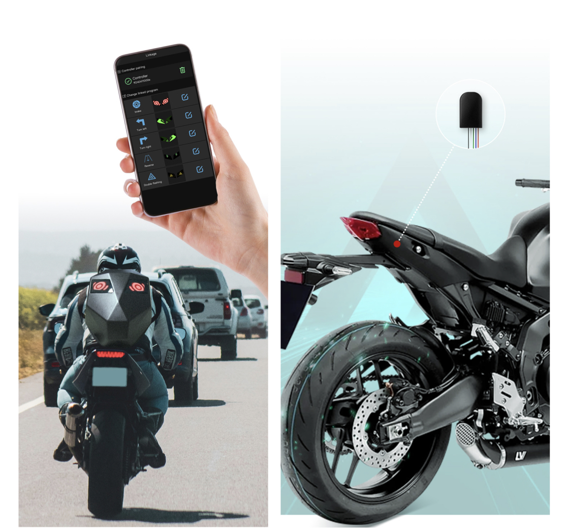 Устройство позволяет синхронизировать работу рюкзака и систему управления мотоцикла (повороты, стоп сигнала)